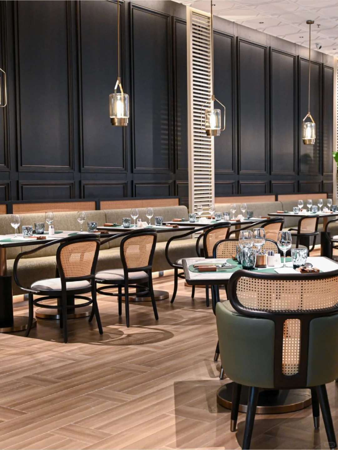 Engineered wood veneer is especially popular due to its color uniformity, which ensures consistent mood lighting across large F&B areas.